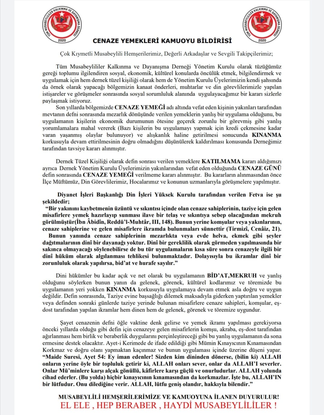 TÜM MUSABEYLİLİLER KALKINMA VE DAYANIŞMA DERNEĞİ YÖNETİM KURULU OLARAK CENAZE YEMEĞİNİN KALDIRILMASI İÇİN ALDIĞIMIZ TAVSİYE KARARIMIZ